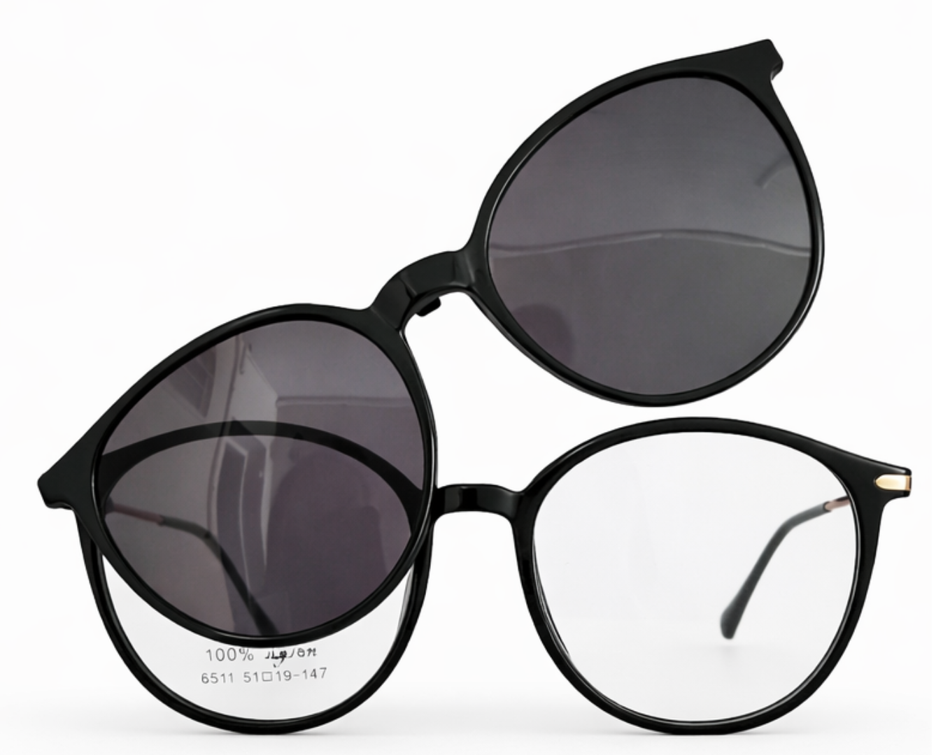 Armação clipon da Ótica Outlet transforma seus óculos comuns em óculos de sol com facilidade, ideal para lentes para longe, perto e multifocal.