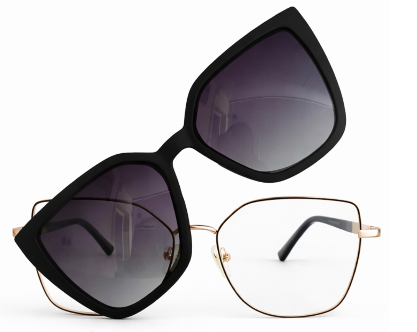 Armação clipon da Ótica Outlet transforma seus óculos comuns em óculos de sol com facilidade, ideal para lentes para longe, perto e multifocal.