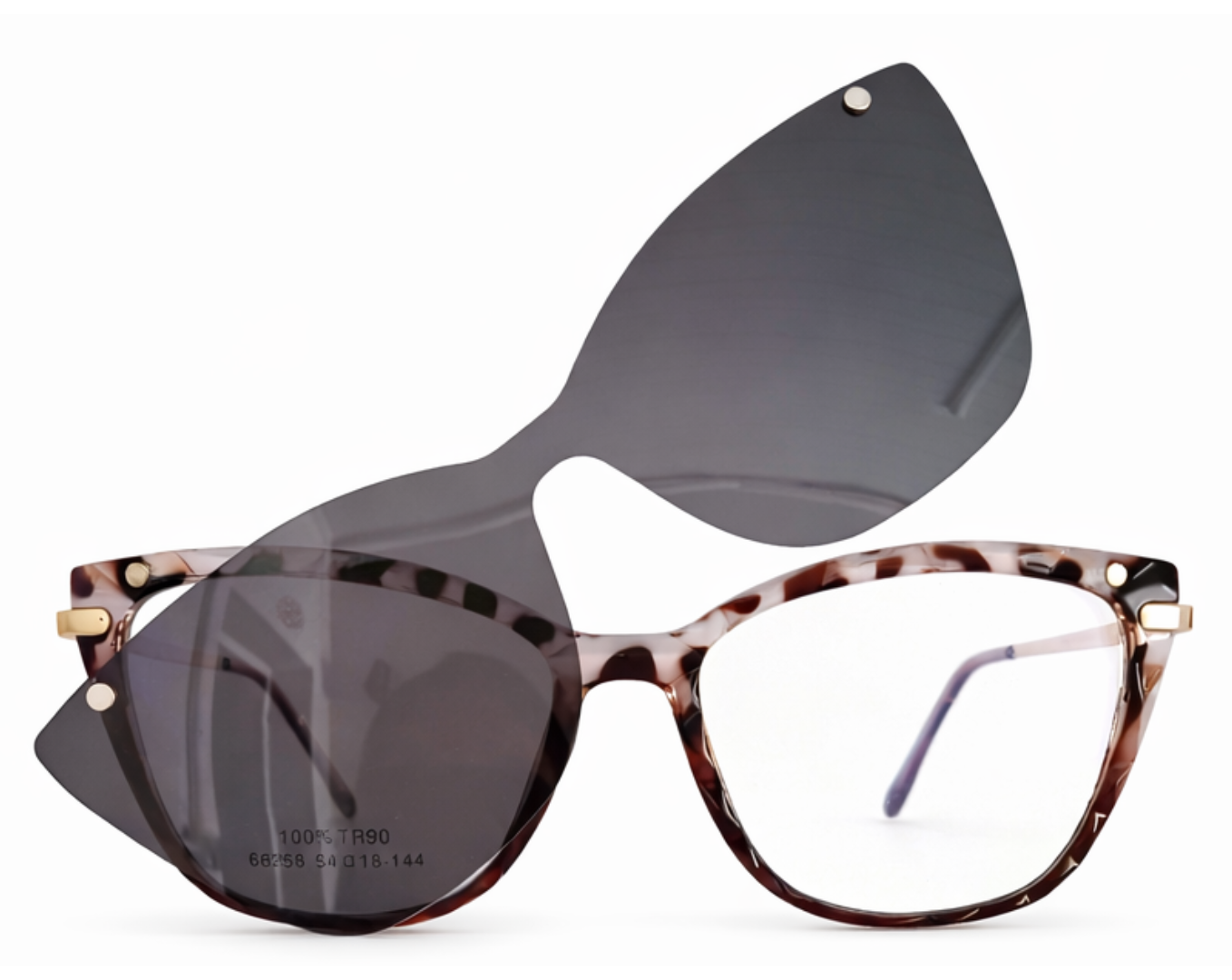 Armação clipon da Ótica Outlet transforma seus óculos comuns em óculos de sol com facilidade, ideal para lentes para longe, perto e multifocal.