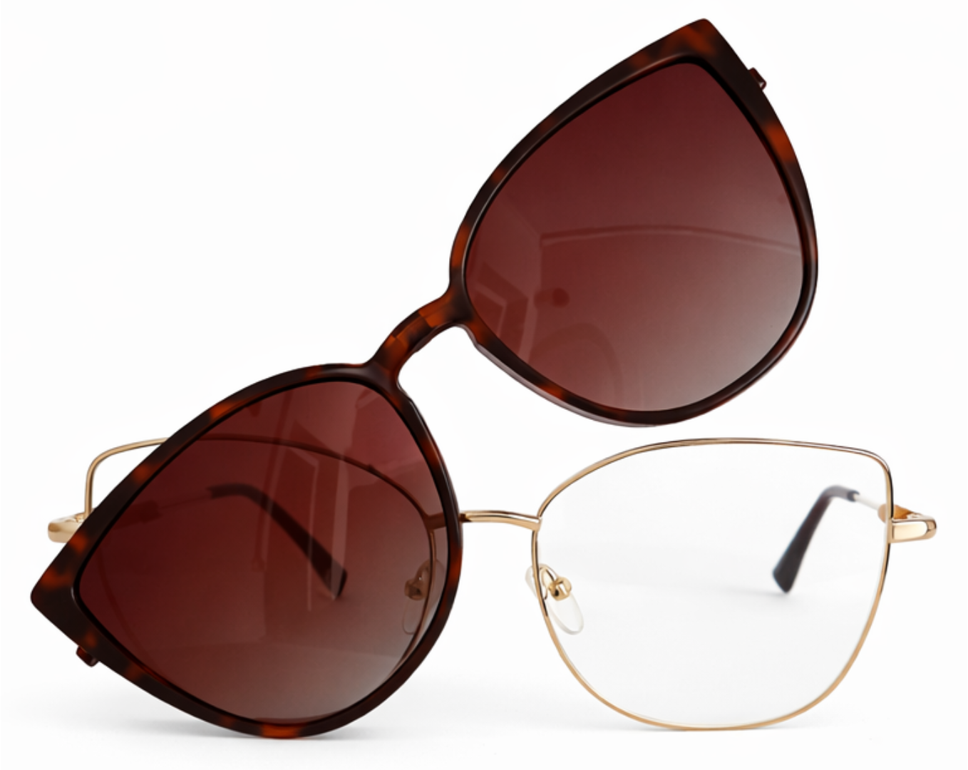 Armação clipon da Ótica Outlet transforma seus óculos comuns em óculos de sol com facilidade, ideal para lentes para longe, perto e multifocal.