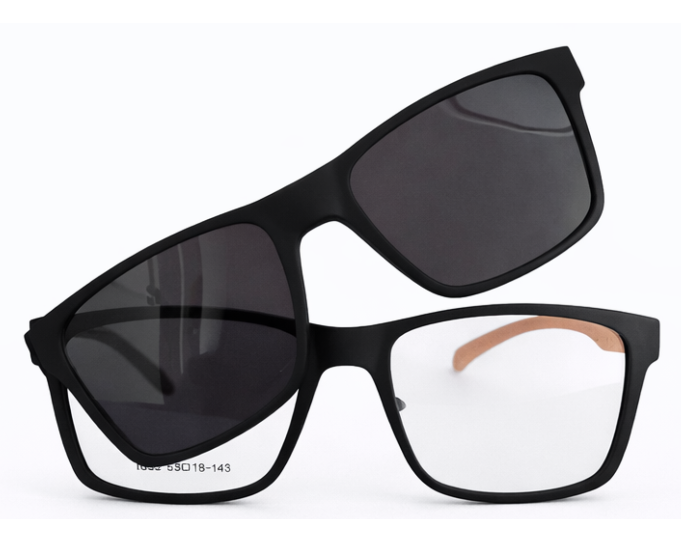 Armação clipon da Ótica Outlet transforma seus óculos comuns em óculos de sol com facilidade, ideal para lentes para longe, perto e multifocal.