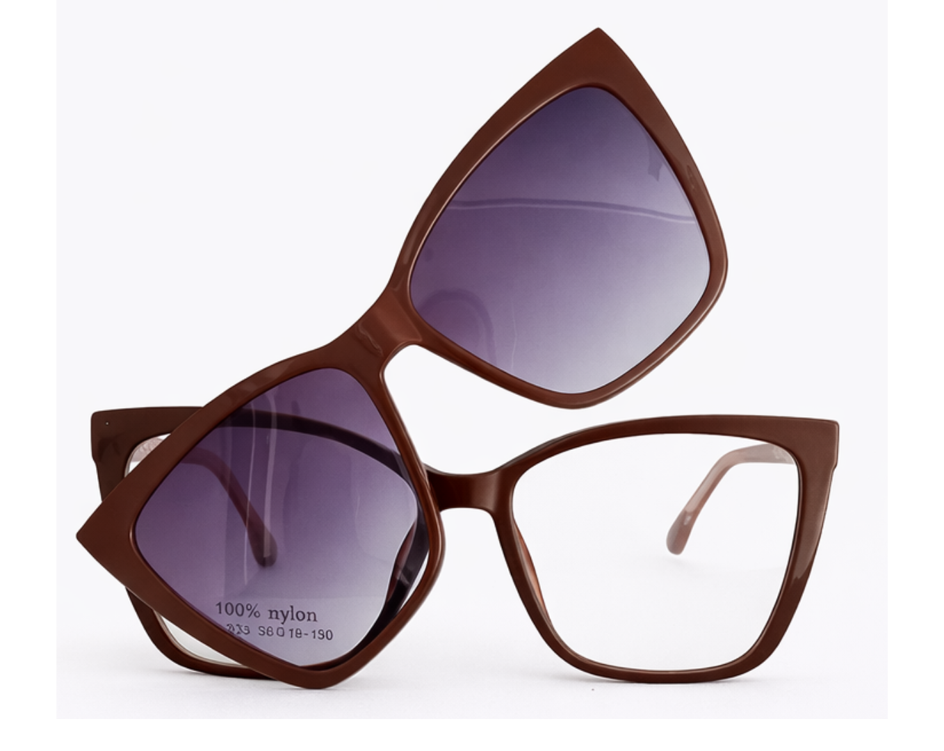Armação clipon da Ótica Outlet transforma seus óculos comuns em óculos de sol com facilidade, ideal para lentes para longe, perto e multifocal.